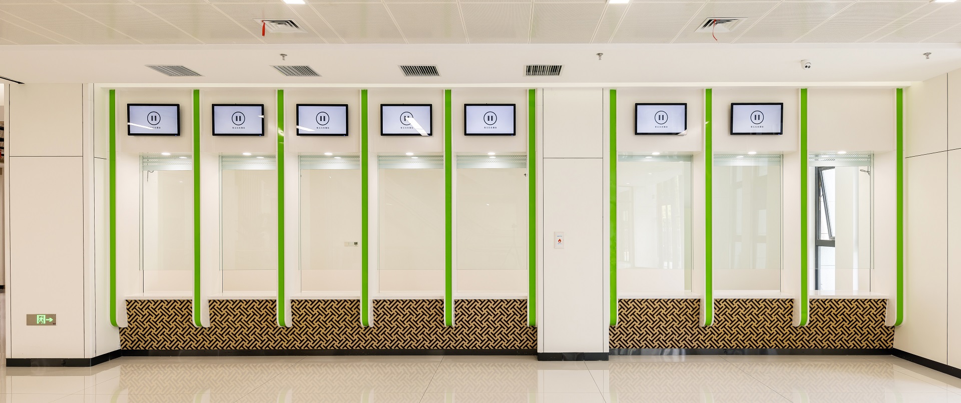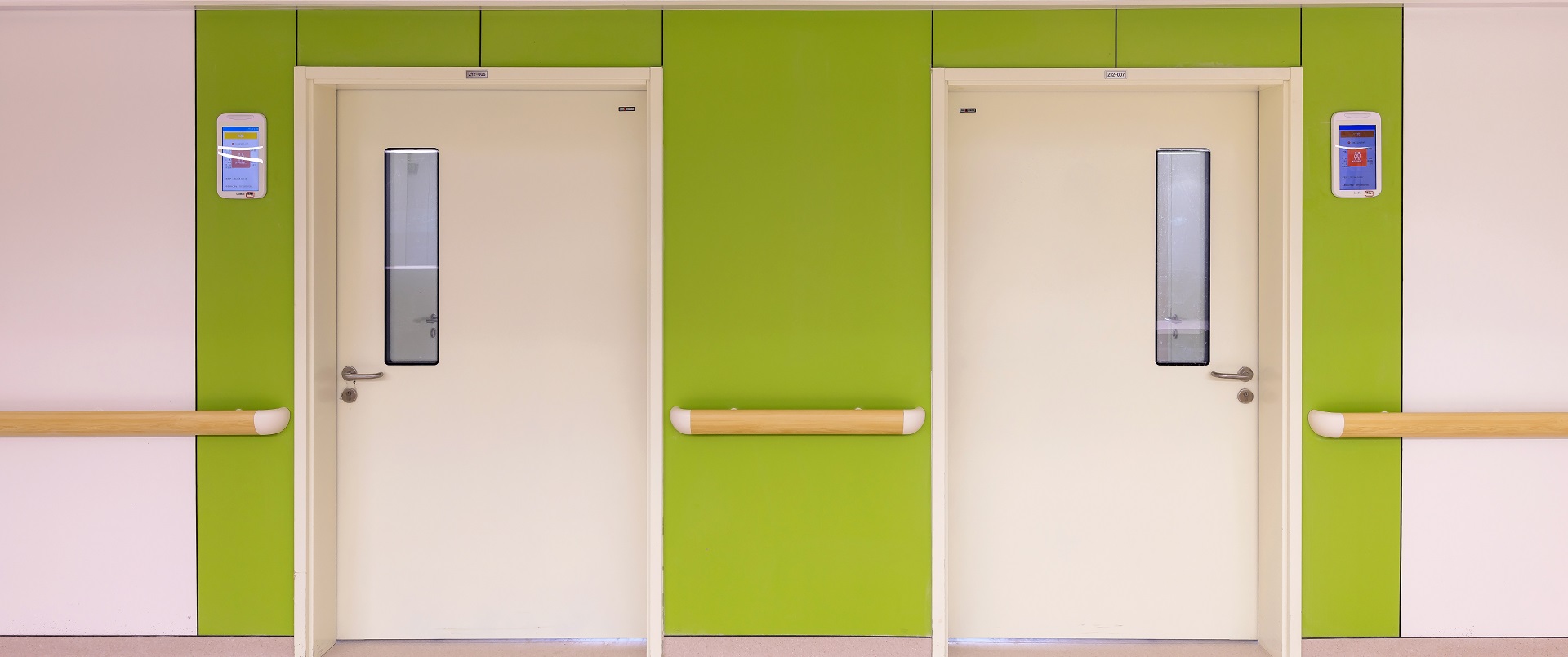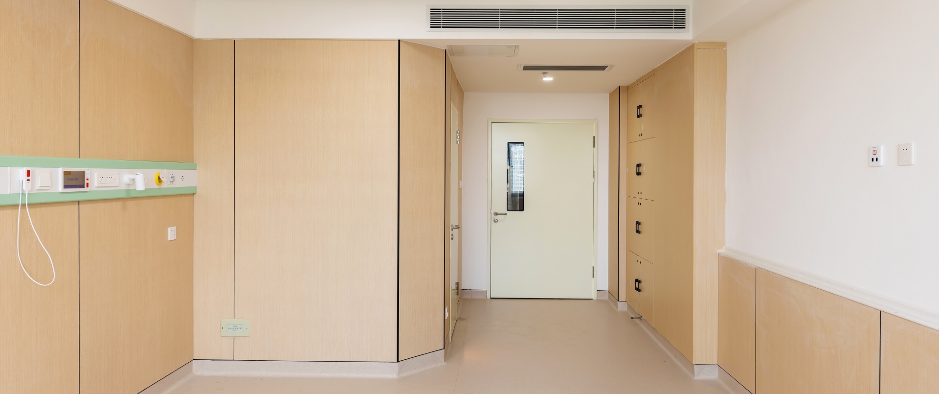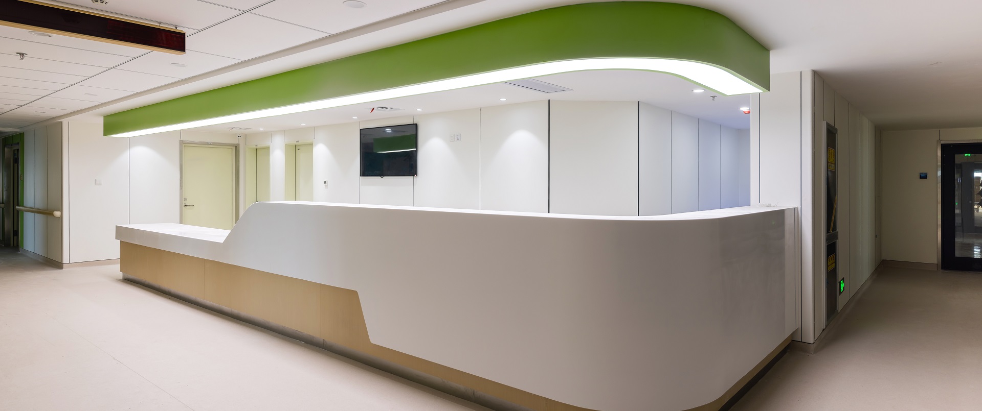 墙面-医疗板:4112-60达喀尔之光 门头-耐火板:Z029-60鹦鹉绿 走廊墙面/包柱-医疗板:1574-60暖白